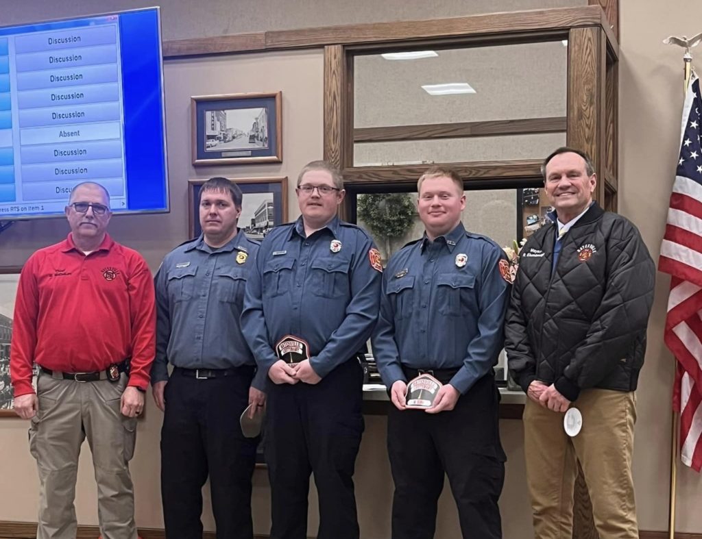 During a special presentation by Batesville Fire Chief Mark McCollum (far left), firefighters Logan Gleghorn (center) and Michael Ring (next to Mayor Elumbaugh, far right) were promoted to lieutenant, while Randy Jones (next to McCollum) was promoted to captain. Chief McCollum also presented Mayor Rick Elumbaugh with a jacket and made the mayor an honorary member of the Batesville Fire Department.