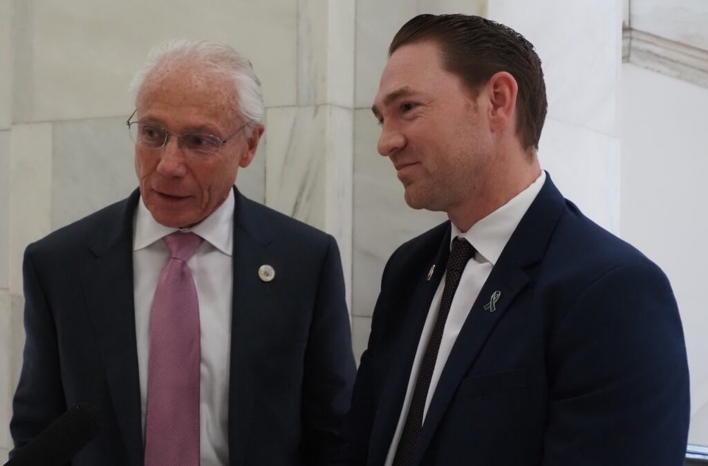 Rep. Jon Eubanks (left) and Sen. Tyler Dees, both Republicans, discuss a bill to restrict cell phone use in schools at the Arkansas Capitol on Jan. 29, 2025. (Mary Hennigan/Arkansas Advocate)