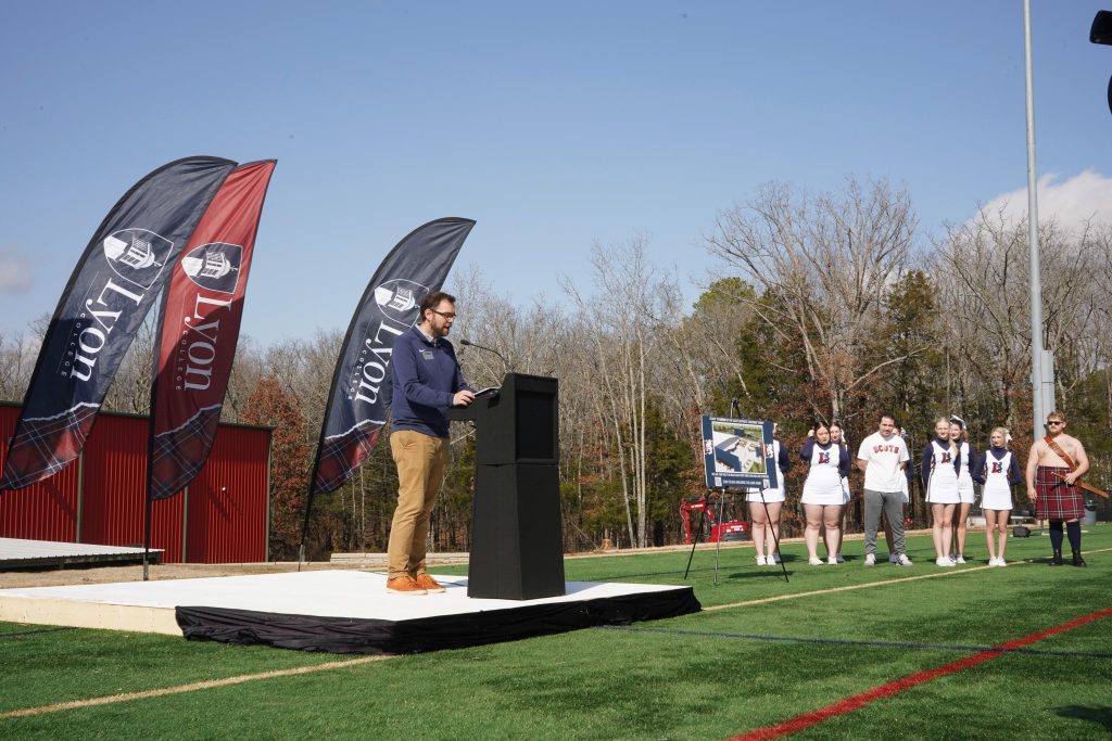 Head football coach Chris Douglas highlighted the impact of the project on recruiting and team development, saying “We’re proudly navy and crimson, now we’re going to be able to rock it here, September 13th.” Commenting on the support of the community and Lyon alumni, Douglas said, “I can’t express how excited I am about the generosity of the community.”