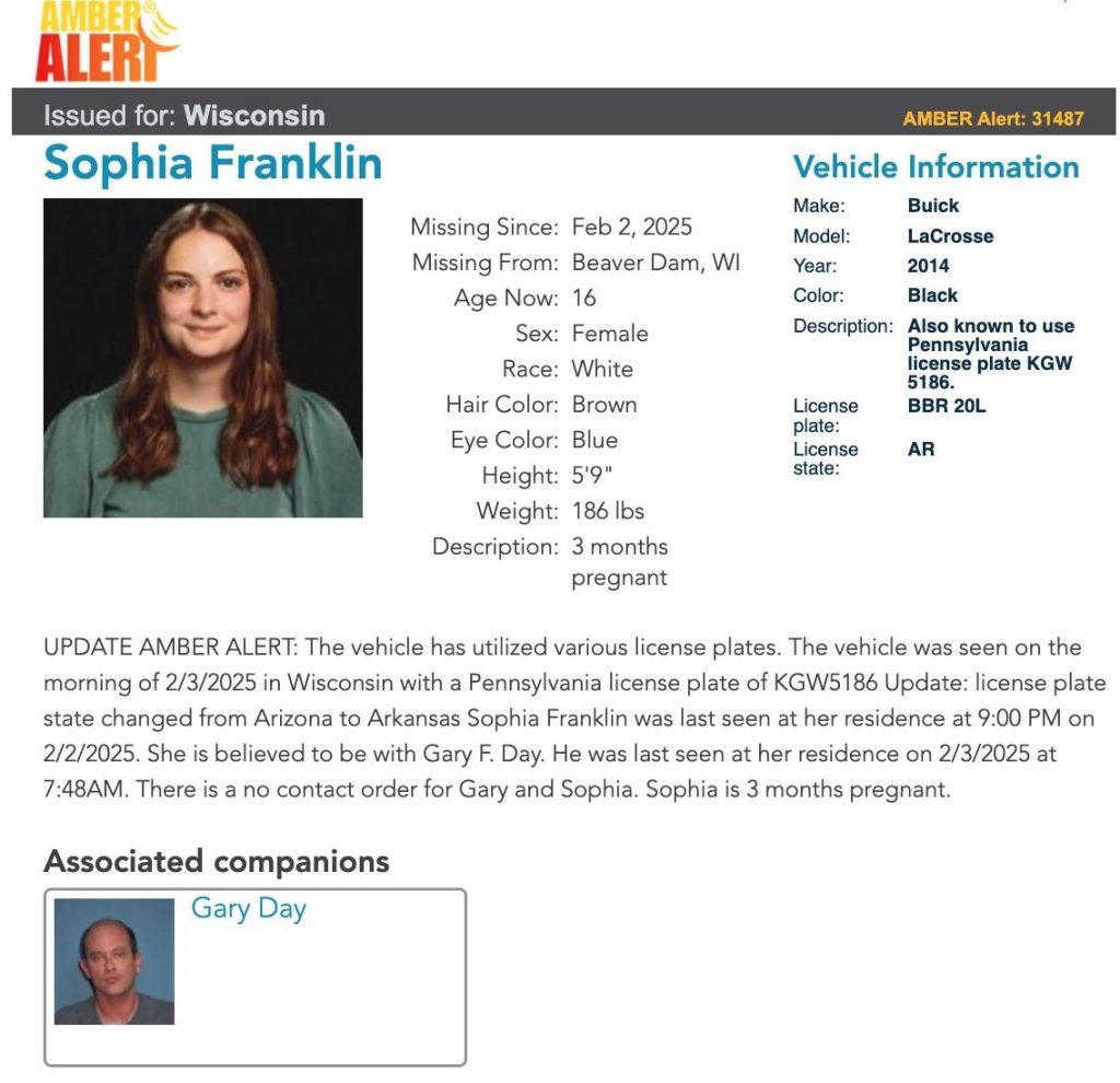 On Monday, Franklin’s father reported her missing again after surveillance footage showed her entering a vehicle believed to be driven by Day. Dodge County, Wisconsin authorities have filed charges of child abduction and enticement.