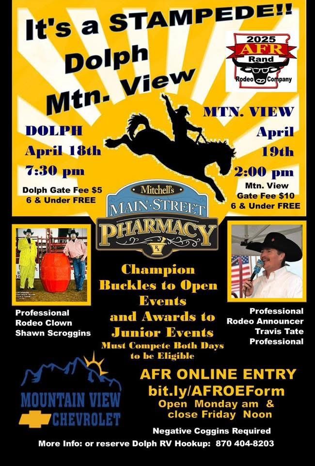 The weekend also includes two rodeo events presented by Rand Rodeo Company. The first takes place Friday night at 7:30 p.m. in Dolph, with a second on Saturday at 2:30 p.m. in Mountain View. Gate admission is $5 in Dolph and $10 in Mountain View; children six and under will be admitted free. The rodeos are sponsored by Mitchell’s Main Street Pharmacy and Mountain View Chevrolet and will feature professional rodeo announcer Travis Tate and rodeo clown Sean Scroggins.