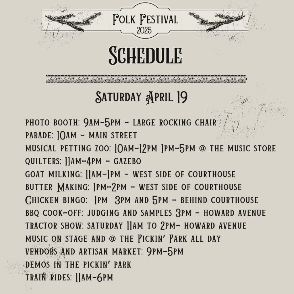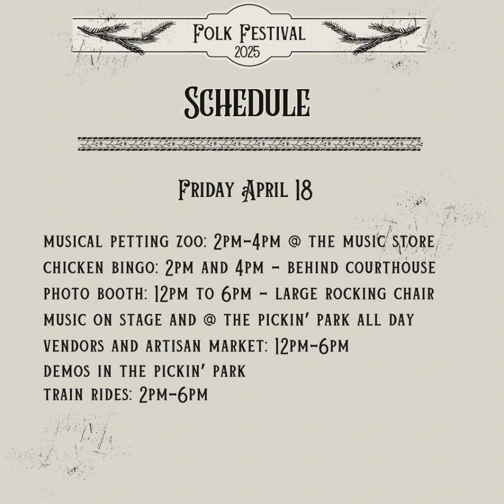 Live folk music will fill the air both days at the downtown main stage and Pickin’ Park, featuring a variety of local and regional musicians. Throughout the weekend, attendees can enjoy artisan markets, vendor booths, train rides, a musical petting zoo, and chicken bingo.