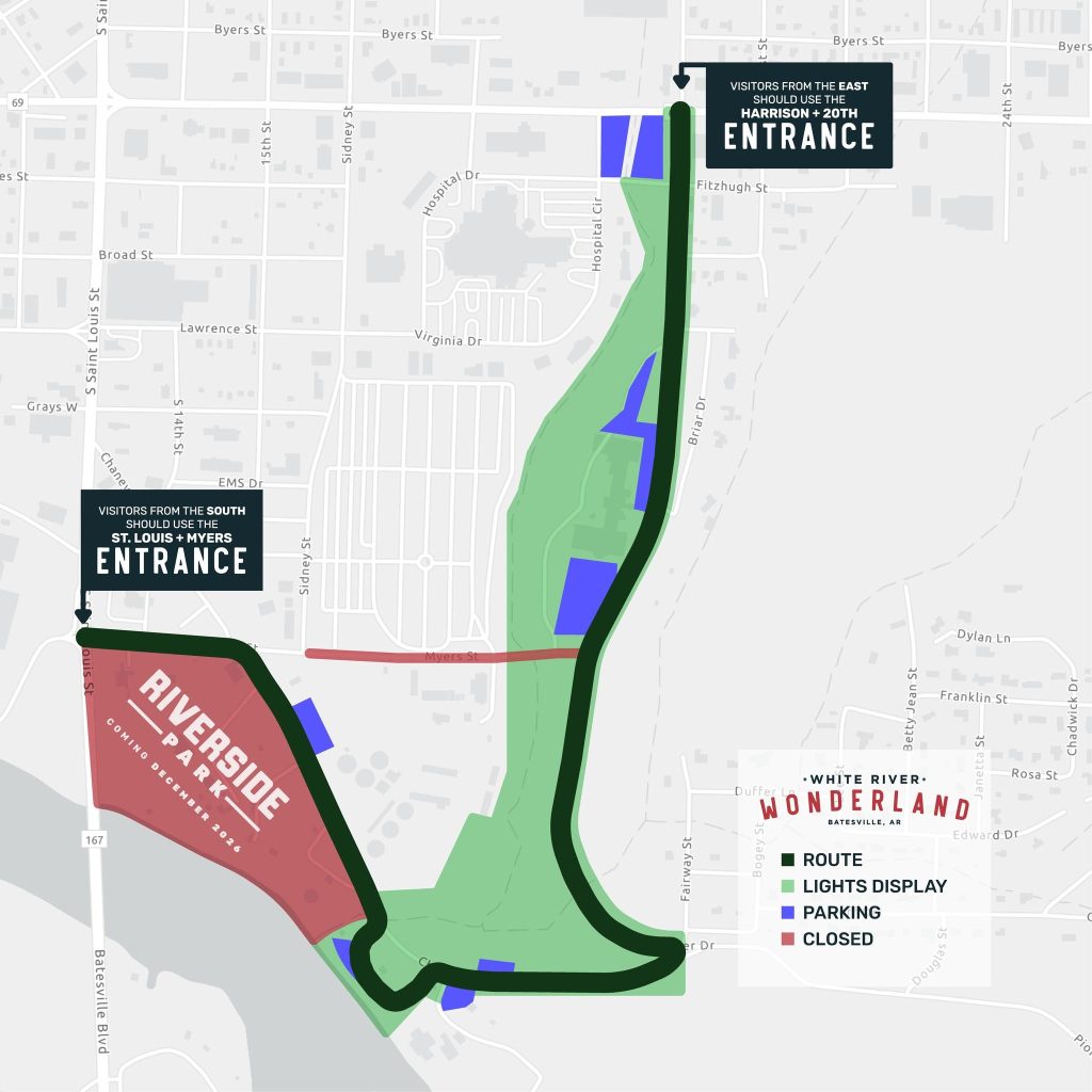 Clearly marked walking routes will assist visitors during walk-through nights and special events. Parking will be available at the Batesville Community Center, White River Health, and Riverside Park. Officials urge guests to avoid blocking driveways and to follow posted signage.