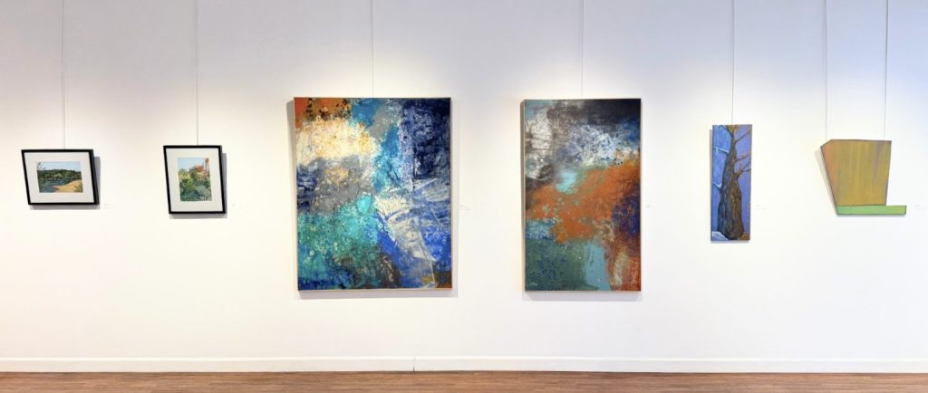 The right gallery wall at the 10th annual BAAC Member Exhibition (left to right): Karen Barker, Dana Finimore, Beth Parker, and Dustyn Bork.