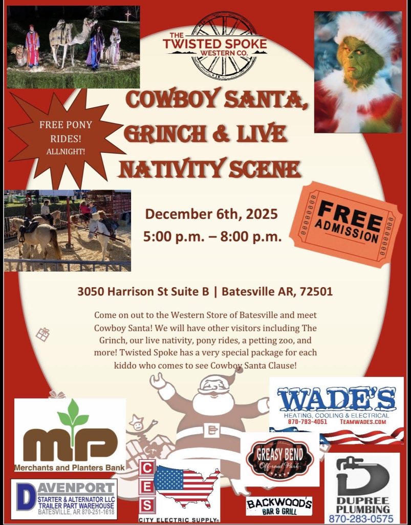 Families will have the chance to meet Cowboy Santa, visit a live nativity scene, and take free pony rides as The Twisted Spoke Western Co. hosts a holiday event on Saturday, Dec. 6, in Batesville.
