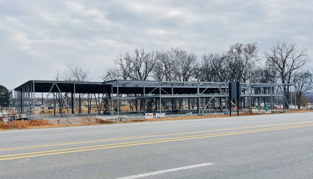 –Public Works Engineer Damon Johnson said the Riverside Park expansion project is ongoing, and the sports courts have been poured, although the coating will not happen until next year, after the extreme cold weather passes, while construction crews are working to get the events center building (below) enclosed.