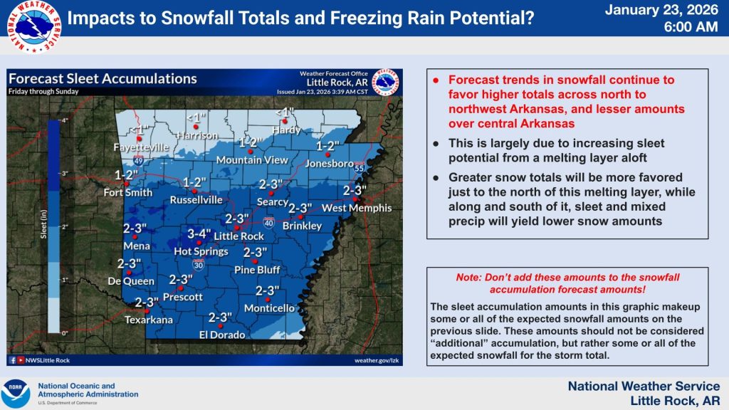 The National Weather Service in Little Rock said a winter storm warning remains in effect from noon Friday through 6 p.m. CST Sunday for large portions of the state, including central, eastern, northern, southern and western Arkansas.