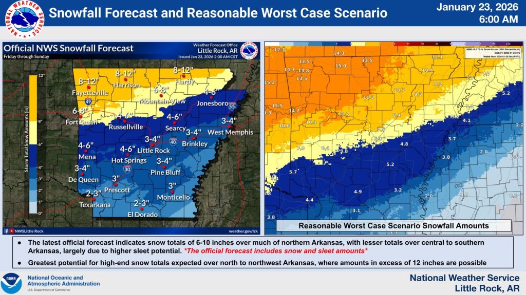 Forecasters expect 6 to 10 inches of snow across northern sections of Arkansas, with 2 to 4 inches of sleet and snow across central areas. Far southern and southeastern parts of the state could see sleet and ice accumulations of up to three-quarters of an inch.