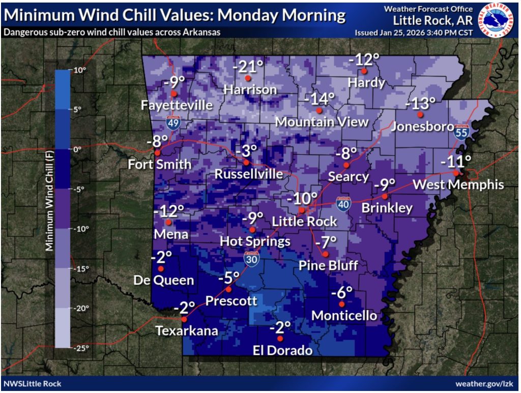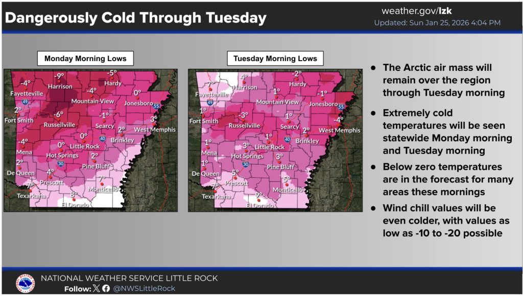 An Extreme Cold Warning remained in effect through noon Tuesday for much of Arkansas, according to the National Weather Service in Little Rock. Forecasters said wind chills could plunge as low as 15 below zero, creating dangerous conditions in which frostbite can develop on exposed skin within minutes.