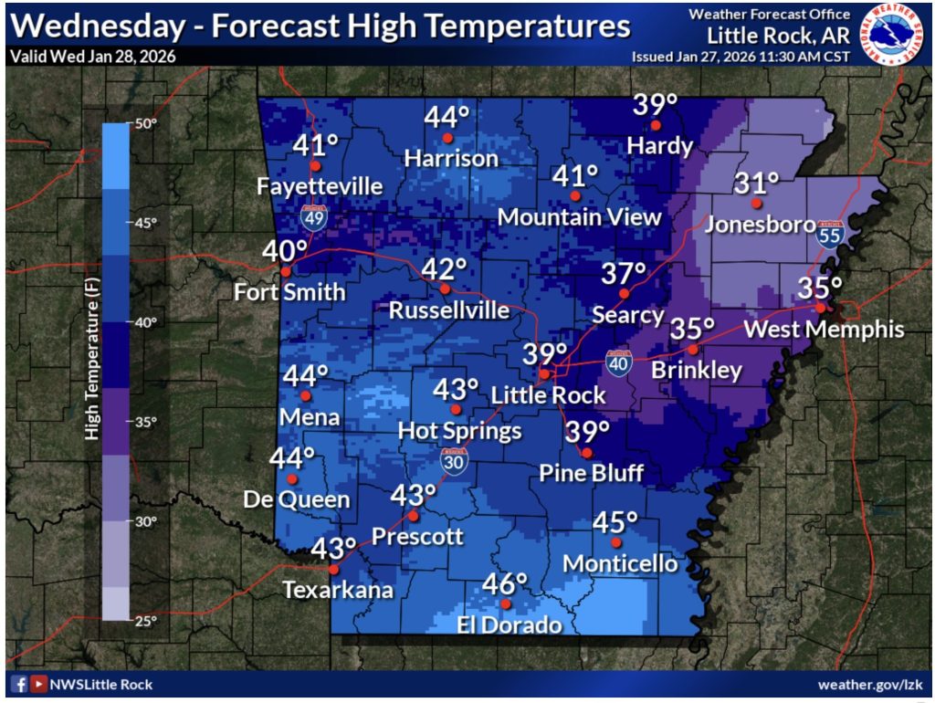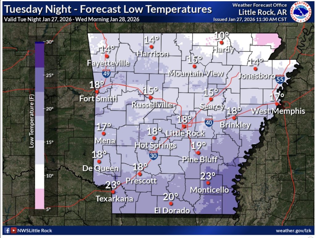 Forecasters said another cold stretch will continue through the end of the week. Lows tonight are expected to fall into the teens across the northern two-thirds of Arkansas, with lower 20s in far southern parts of the state. Patchy freezing fog is possible overnight into Wednesday morning, mainly across central and southern Arkansas.