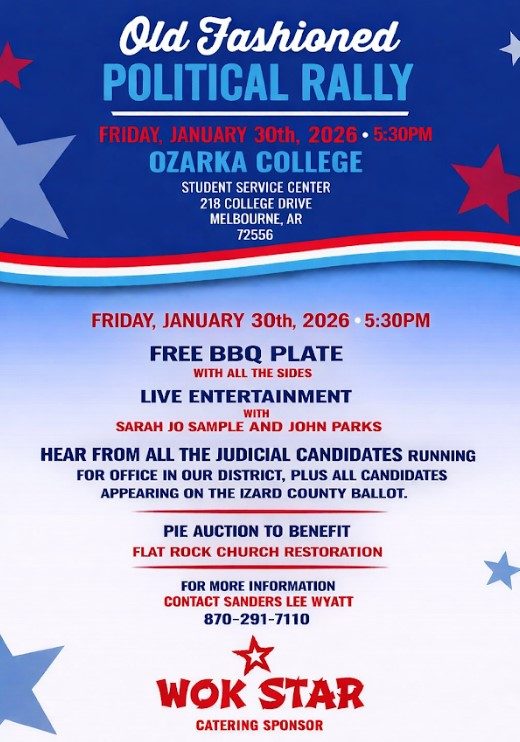 The event is scheduled for 5:30 p.m. at the John E. Miller Education Complex. Organized in part by Sanders Lee Wyatt, the rally precedes the March 3 election and features candidates from Izard County and the 16th Judicial District.