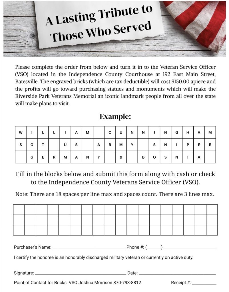 Morrison also said there is another fundraiser selling bricks at the site for $150 each. These can be inscribed with veterans’ name, rank, service time/location, military decorations or other information. The honoree does not have to be local, he added. For information about the bricks, contact Morrison at 870-793-8812.