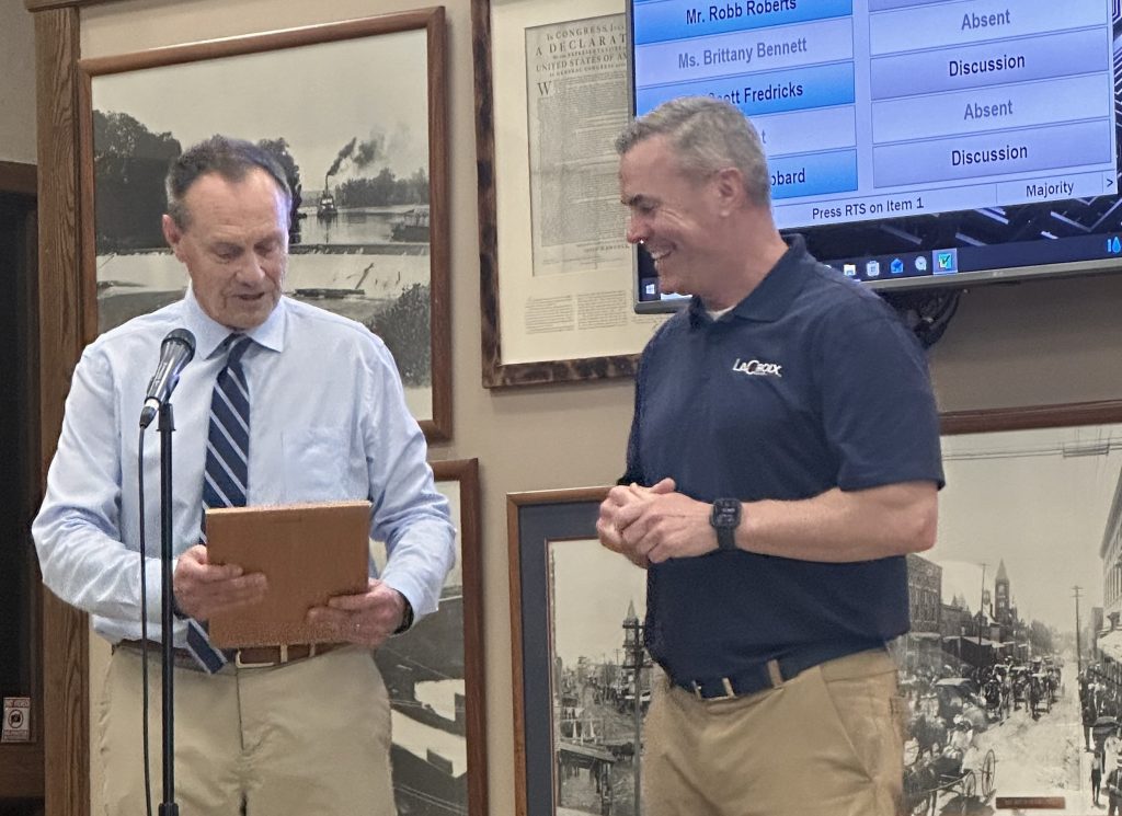 The mayor and council presented Warden with a plaque honoring his 20 years of leadership and service to the airport. “And, we hope you’re up for another 20 years,” Elumbaugh said with a grin, but Warden responded, “If we can get this runway resurfaced, this may be my swan song.”